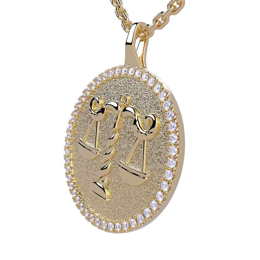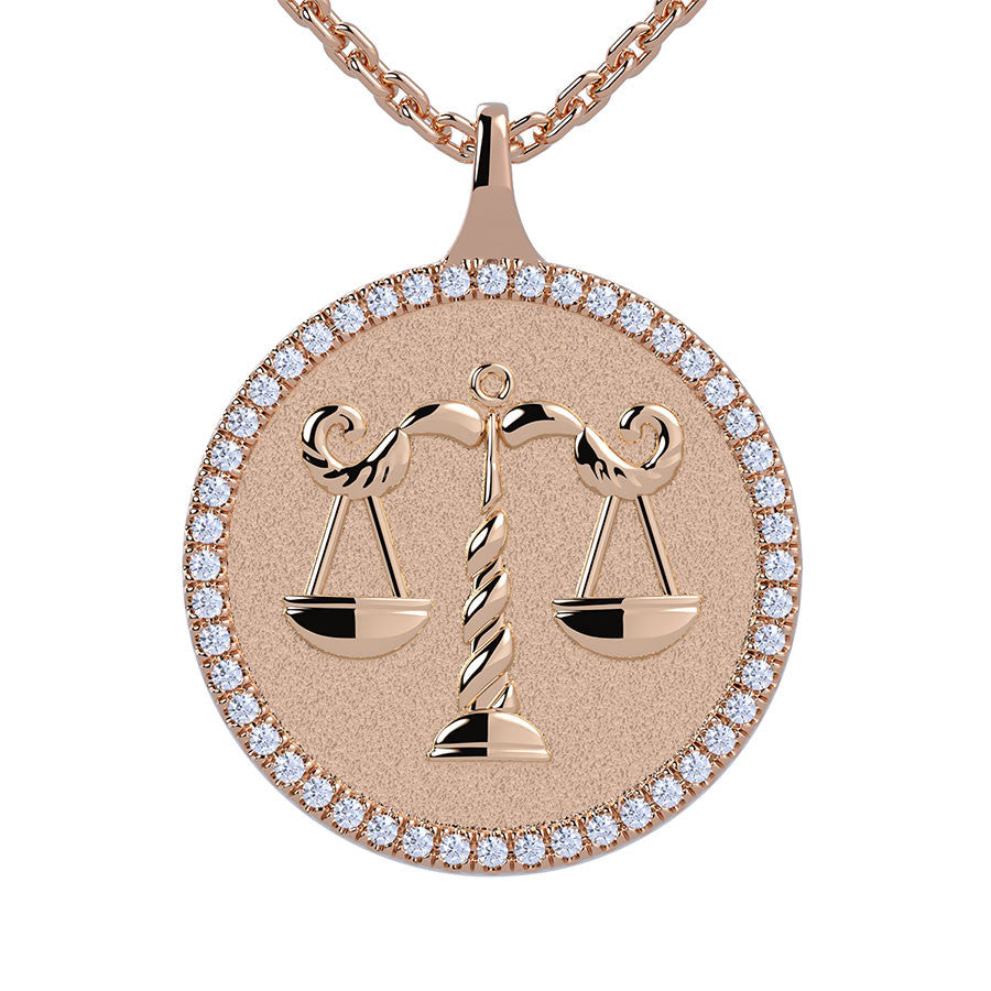 This beautiful and trendy pendant features the libra zodiac design, 0.25ct of VS, E/F quality diamonds, measures 20mm in diameter, and is available in 14k gold, 18k gold and platinum. It comes with your choice of chain, or you can opt for no chain at all.